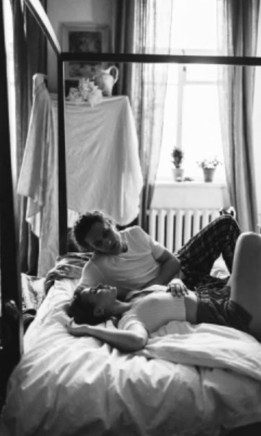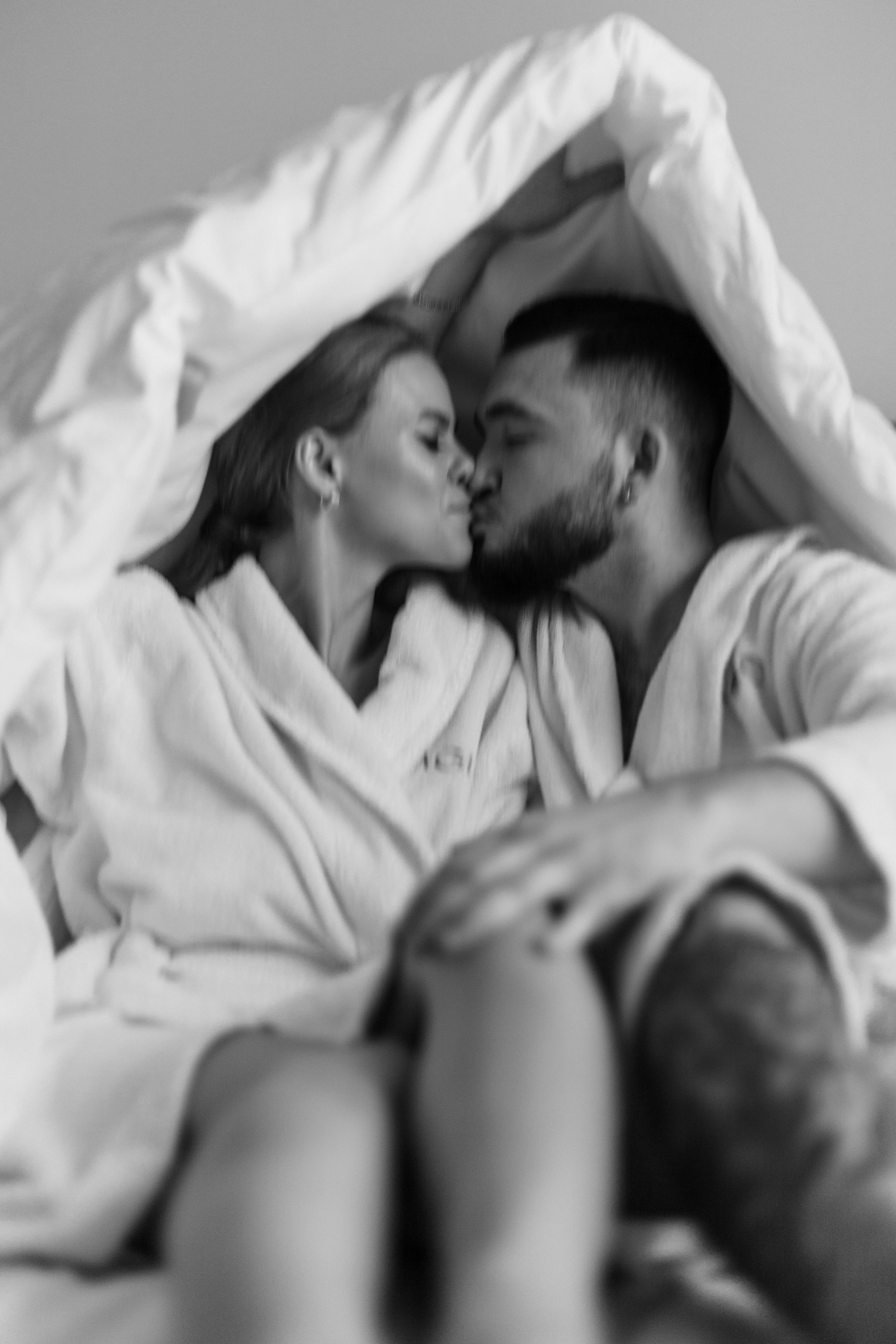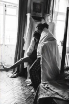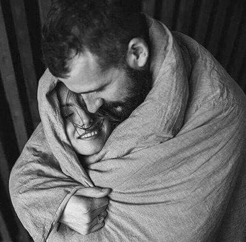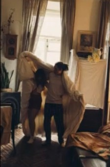 Пара стоит напротив окна в одеяле, обнимаются, смотрят друг на друга скидывают одеяло и начинают танцевать на одеяле